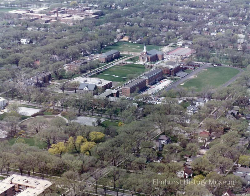 Aerial view of Elmhurst College campus with York High School in background.Photograph Details