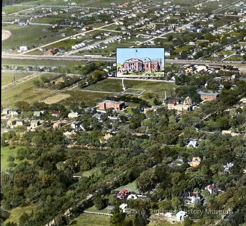 Drawing of Elmhurst College Gymnasium (later Goebel Hall), imposed on an aerial photograph of College Campus.Photograph Details