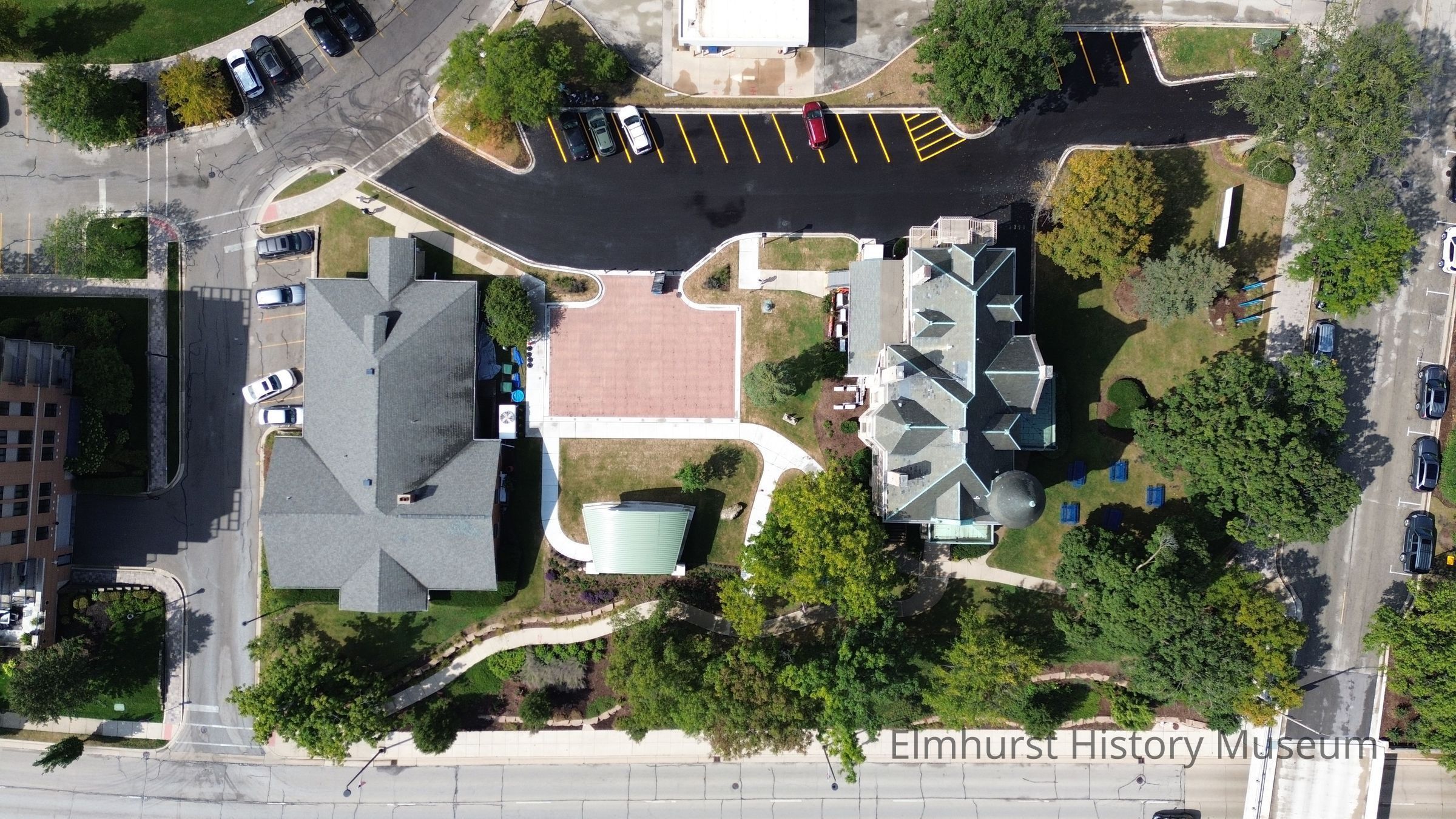 Aerial view of the Elmhurst History Museum grounds shortly after the repaving of the parking lot in September 2025.Photograph Details
