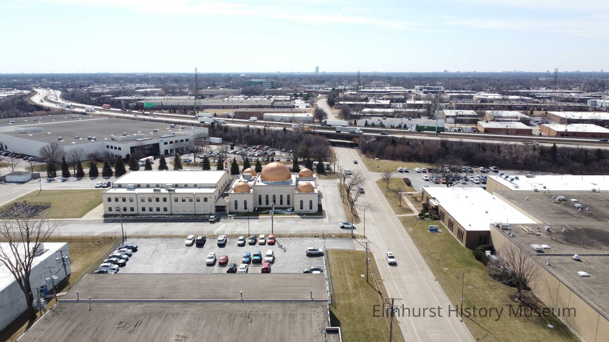 Aerial view of the Elmhurst Industrial Park, looking south on Church Road from Carol Lane towards Interstate 290. St. Demetrios Greek Orthodox Church is in the foreground.Photograph Details