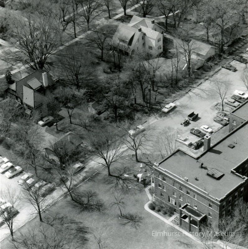 Aerial view of an Elmhurst College building, Schick Hall, and surrounding neighborhood.Photograph Details
