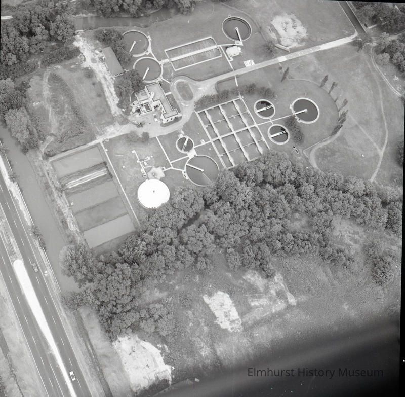 Aerial view of sewage and wastewater disposal plant in Elmhurst, alongside Route 83.Photograph Details