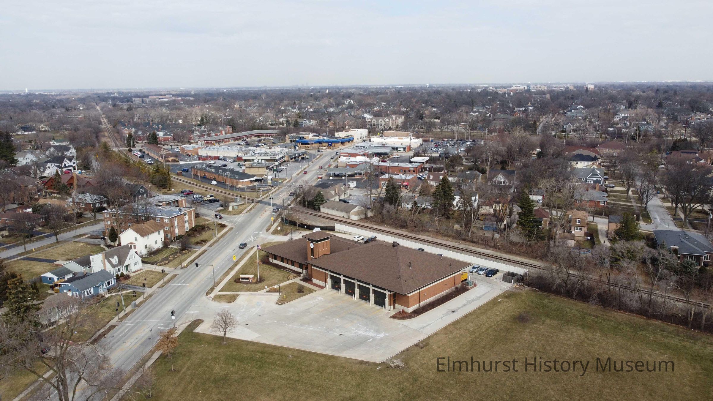 Aerial view of Elmhurst Fire Department Station No. 2 at 605 S. York, looking northwest towards the York and Vallette Business District.Photograph Details