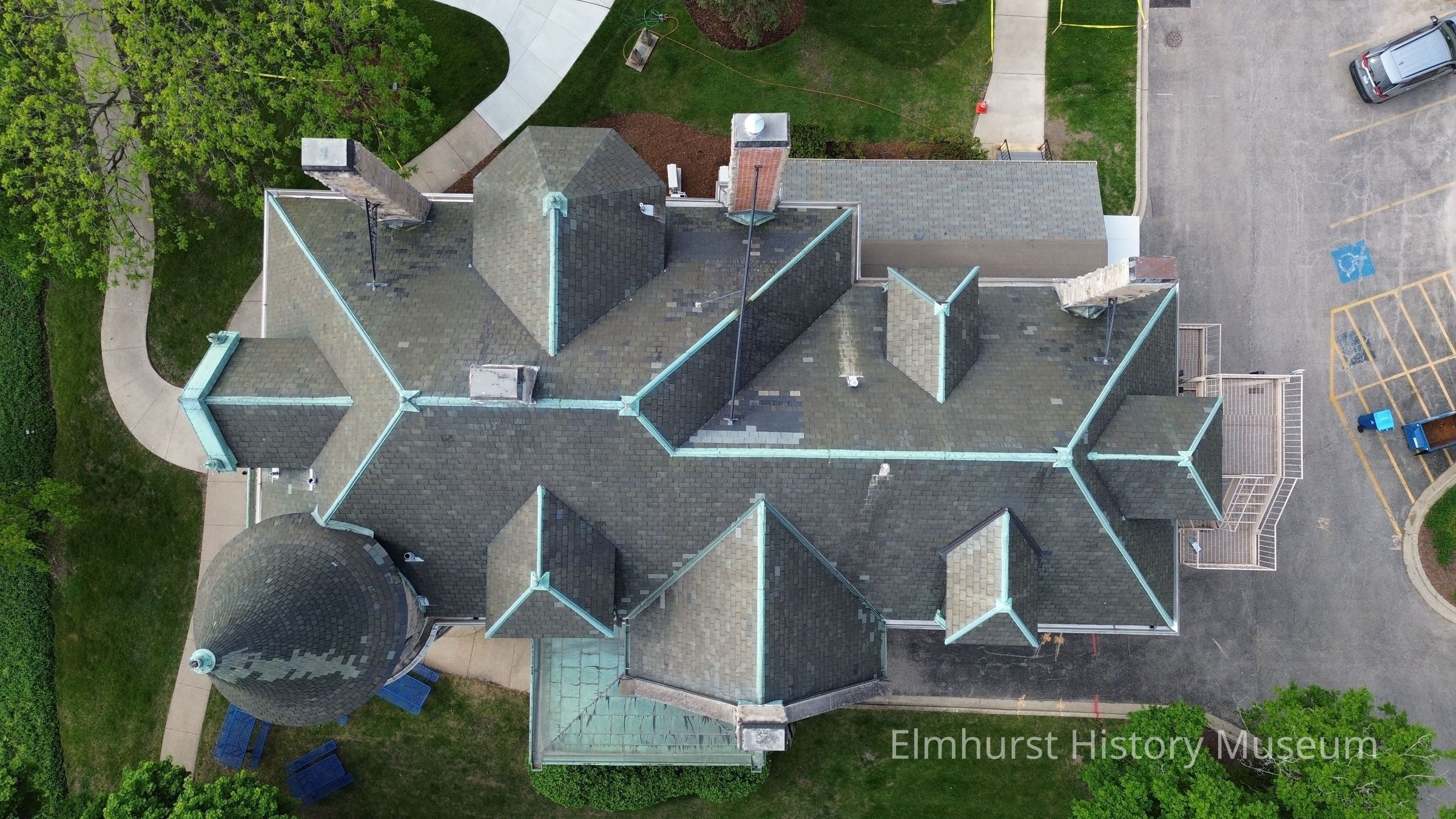 Aerial view of the roof of the Elmhurst History Museum in the Glos Mansion.Photograph Details