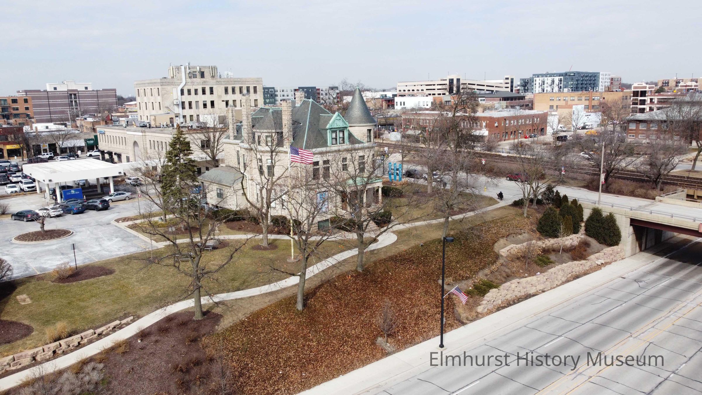 Aerial view of the Glos Mansion at 120 E. Park Avenue, looking northwest across Robert T. Palmer Drive from Glos Memorial Park.Photograph Details