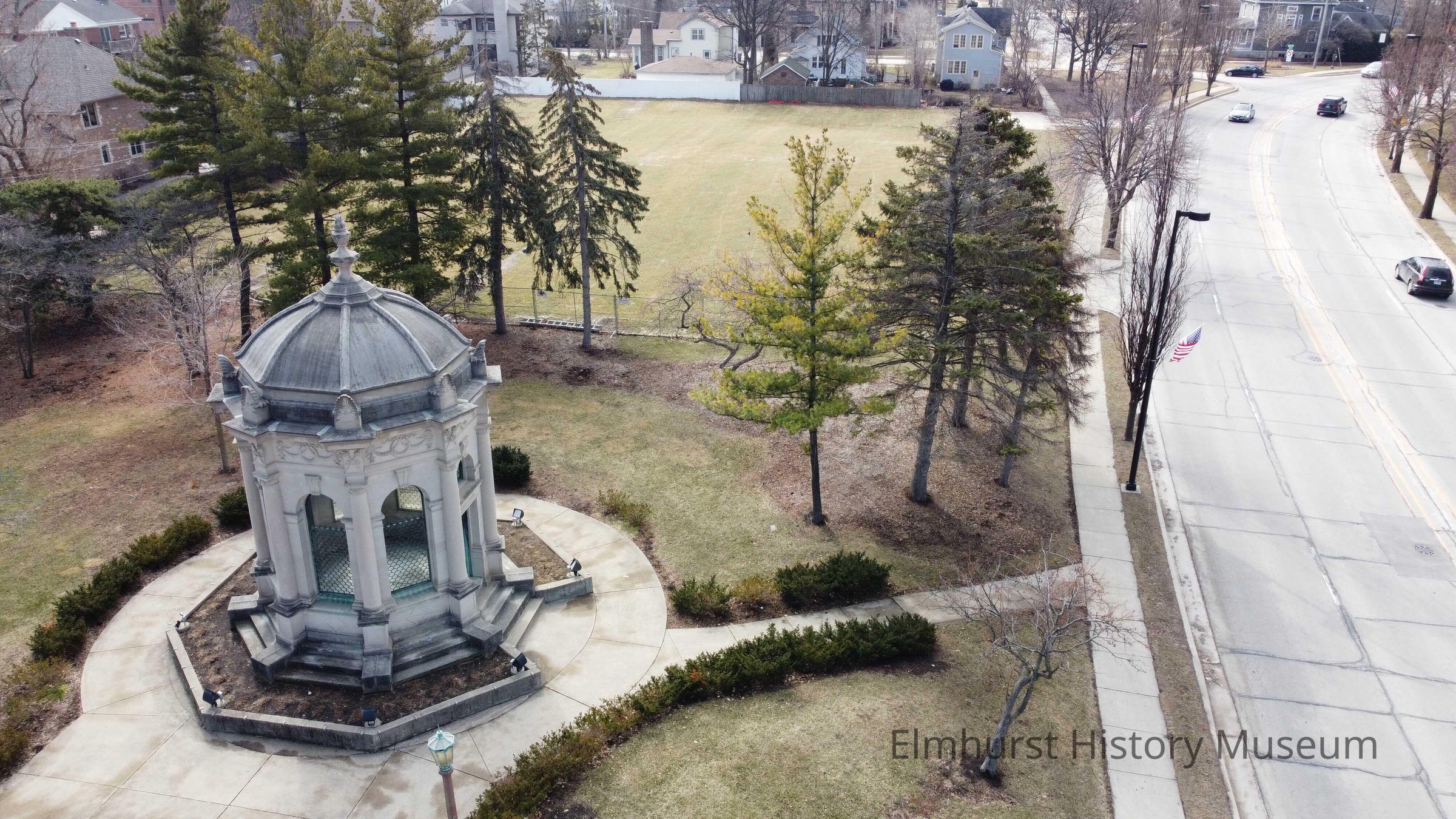 Aerial view of the Glos Mausoleum at Glos Memorial Park. The lot at 135 Robert T. Palmer Drive is in the background, to be developed as a part the park.Photograph Details