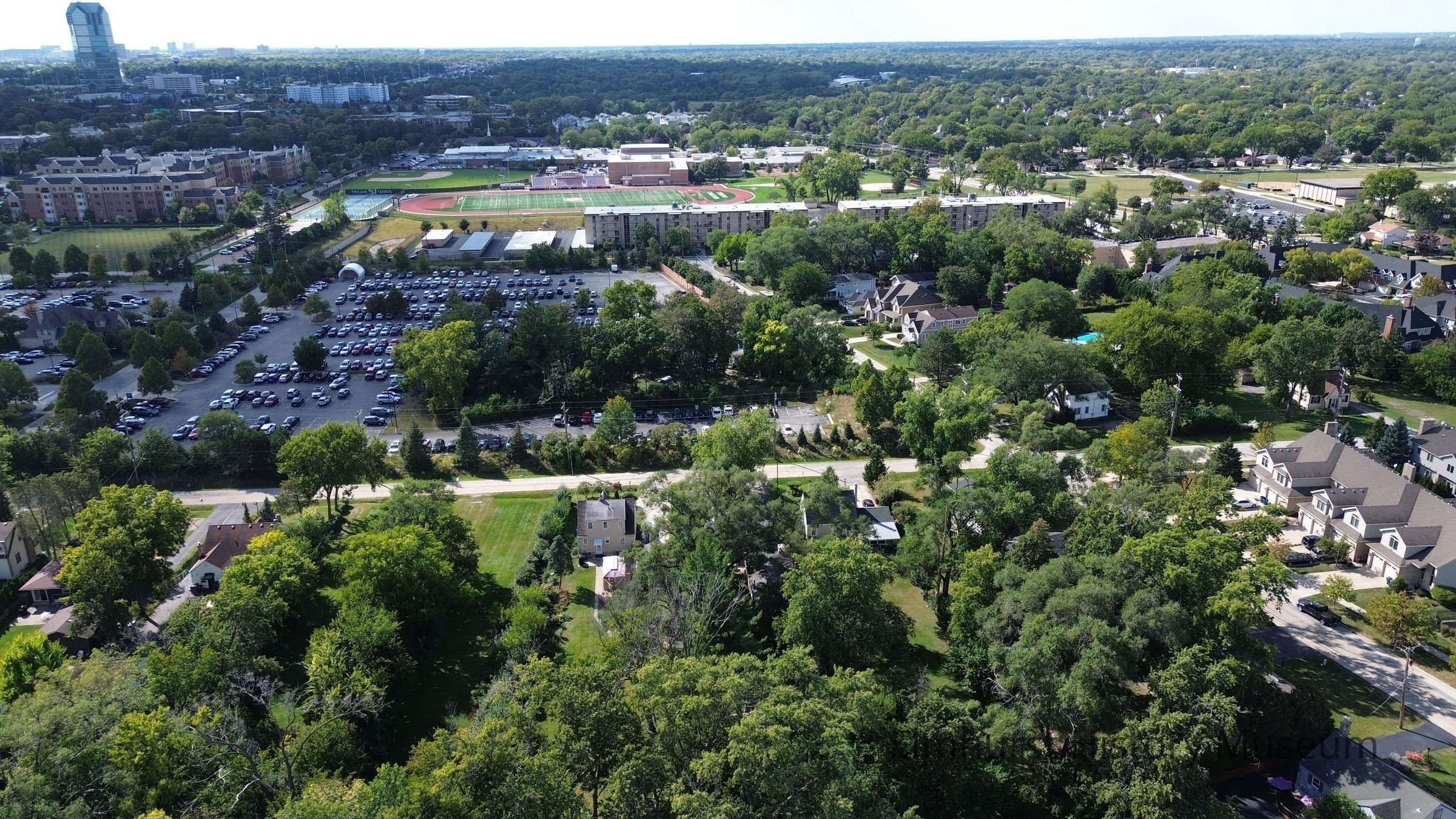Aerial View of Elmhurst Memorial Hospital employee parking lot, looking west over Kirk Avenue towards Timothy Christian School.Photograph Details
