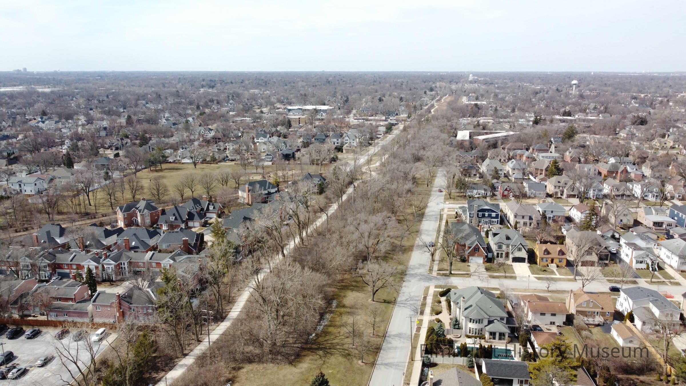 Aerial view of the Illinois Prairie Path, looking west from S. York Street.Photograph Details