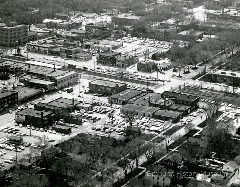 Aerial view of Downtown Elmhurst between Addison Avenue and Larch Avenue, north of the Chicago and North Western Railroad, looking southeast.Photograph Details