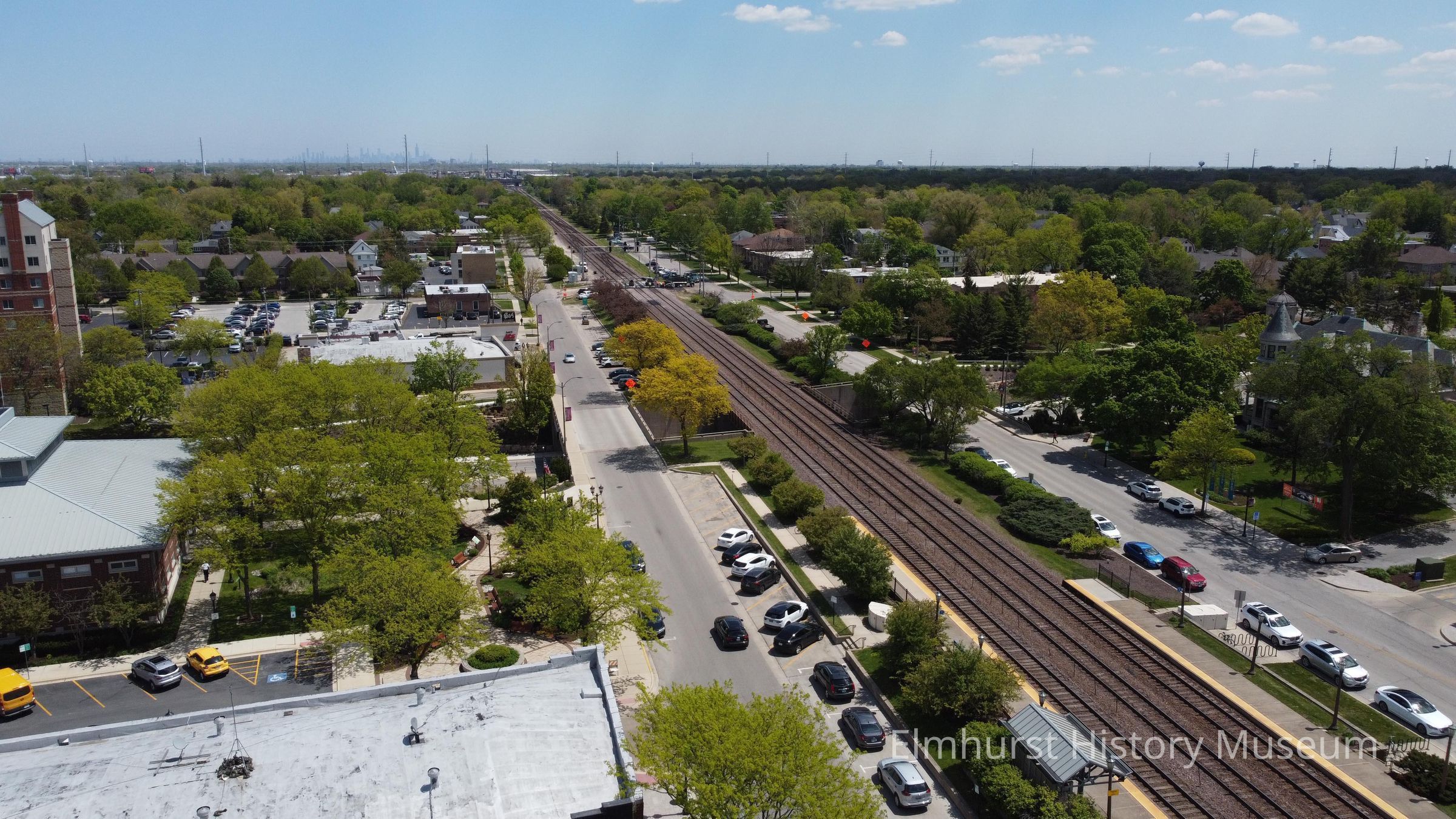 Aerial view of Elmhurst looking east along the Metra railroad tracks and E. First Street. Glos Mansion is at right, and the Police Station is at left.Photograph Details