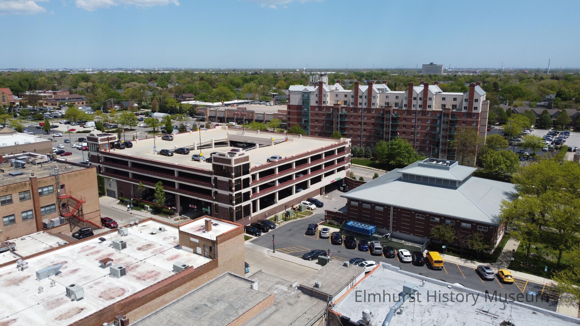 Aerial view of Elmhurst looking northeast, towards the Schiller Parking Deck.Photograph Details