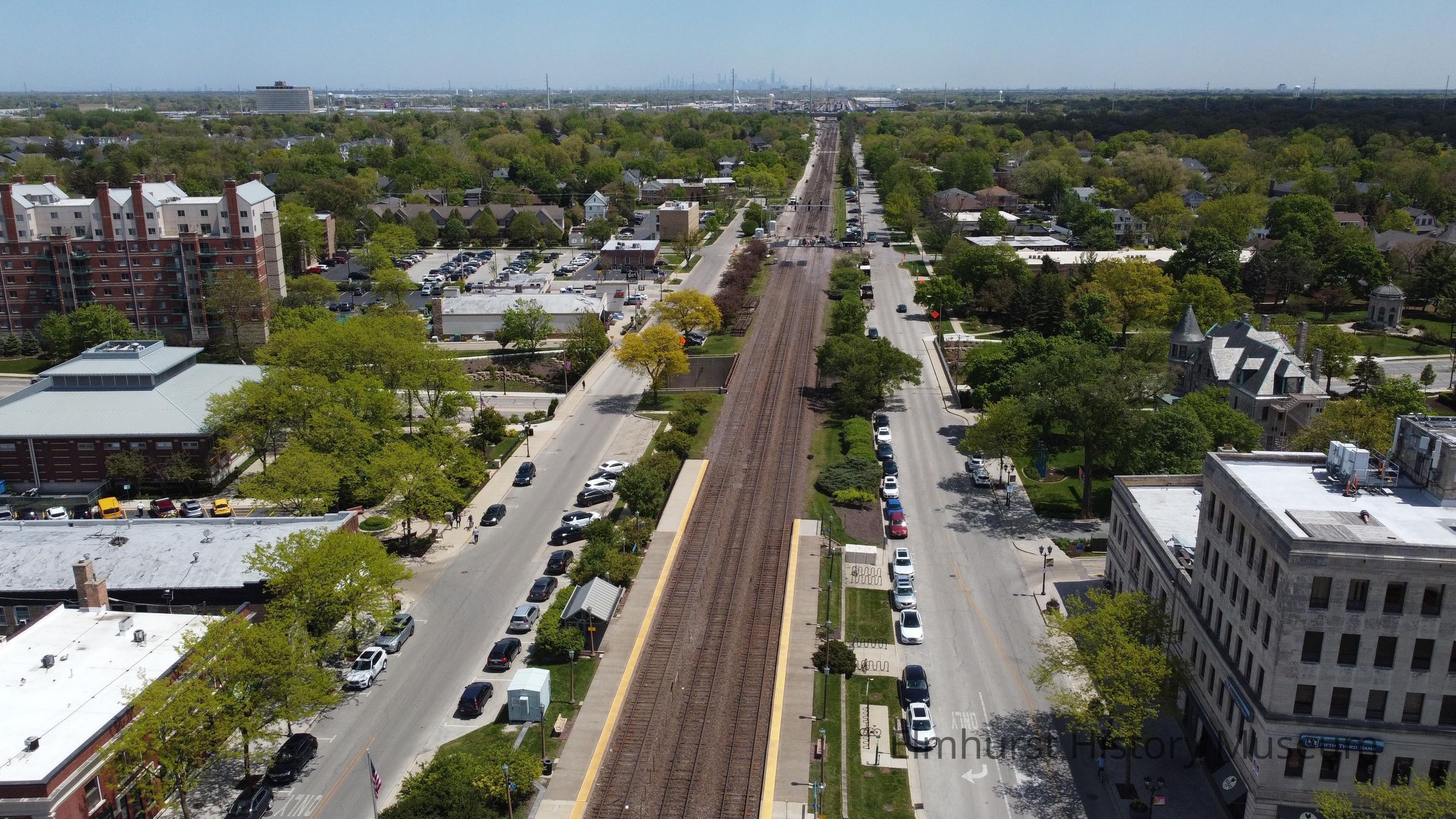 Aerial view of Elmhurst looking east along the Metra railroad tracks. Photograph shows the length of E. First Street and E. Park Avnue.Photograph Details