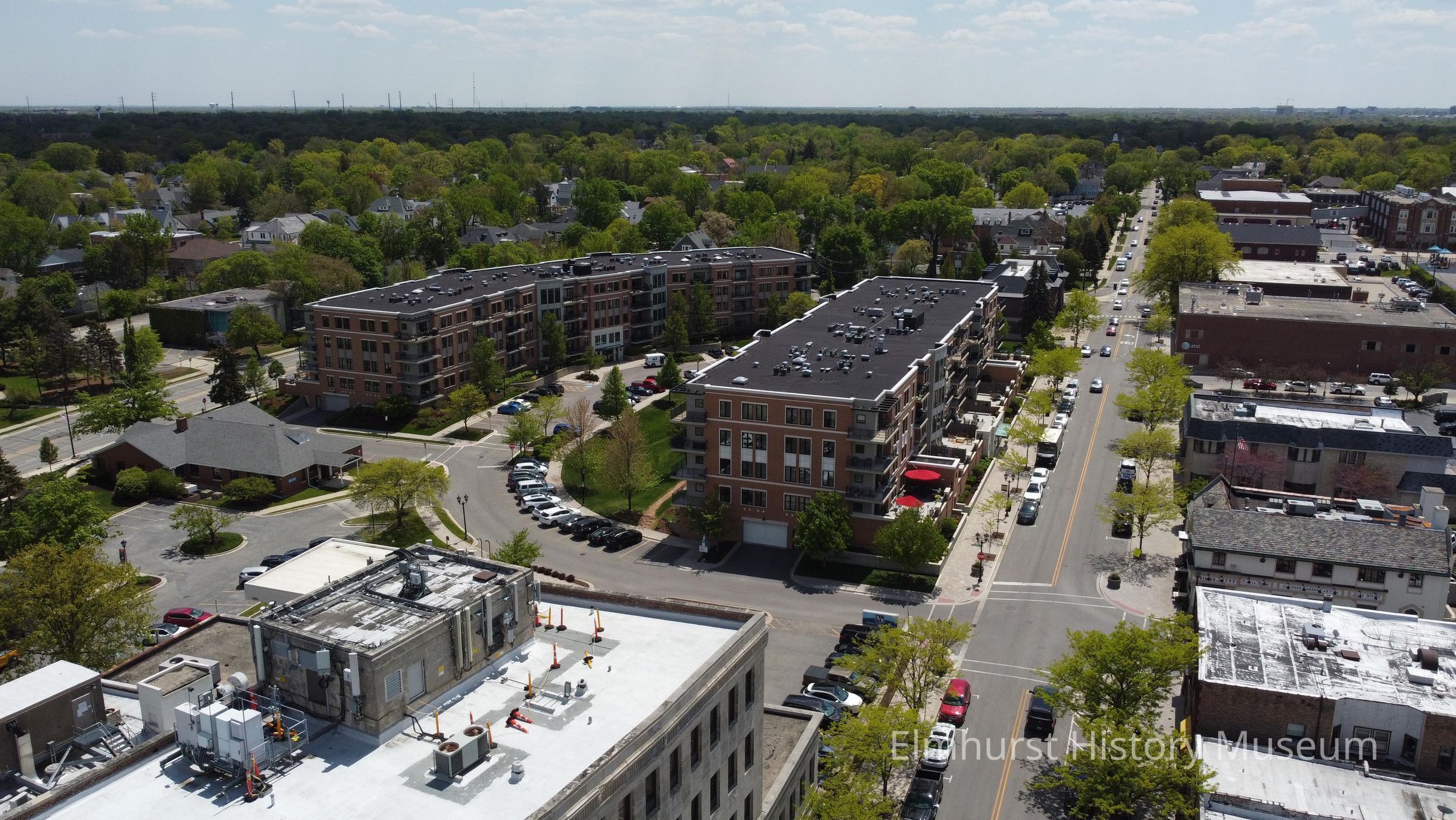 Aerial view of Elmhurst looking south along S. York Street. Crescent Court Condominiums are at center, and the Elmhurst History Museum Education Center is at left.Photograph Details