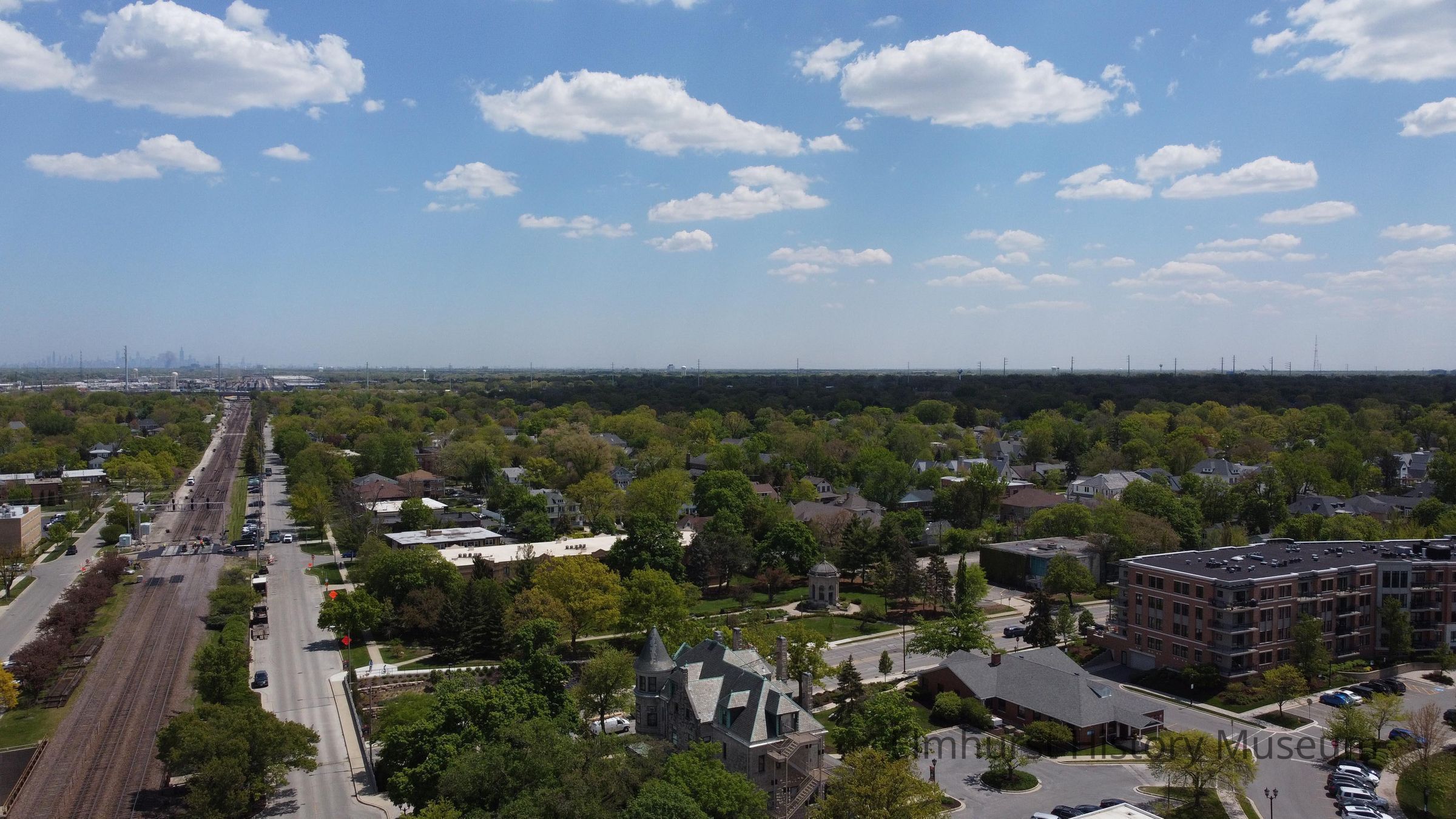 Aerial view of Elmhurst looking east along the Metra railroad tracks. The Elmhurst History Museum in the Glos Mansion is in the foreground.Photograph Details