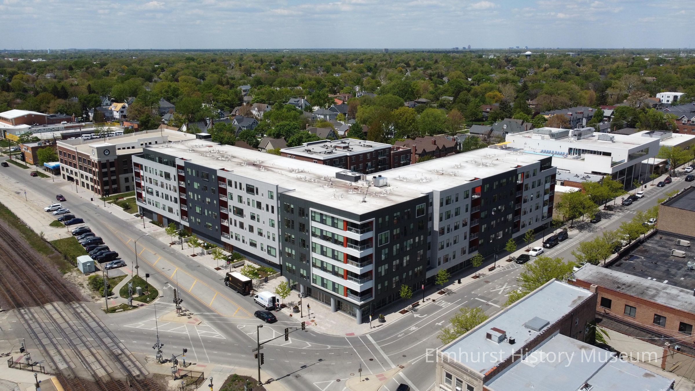 Aerial view of Elmhurst looking northwest from the intersection of W. First Street and Addison Avenue. The Marke apartment building at 100 N. Addison is in the foreground.Photograph Details