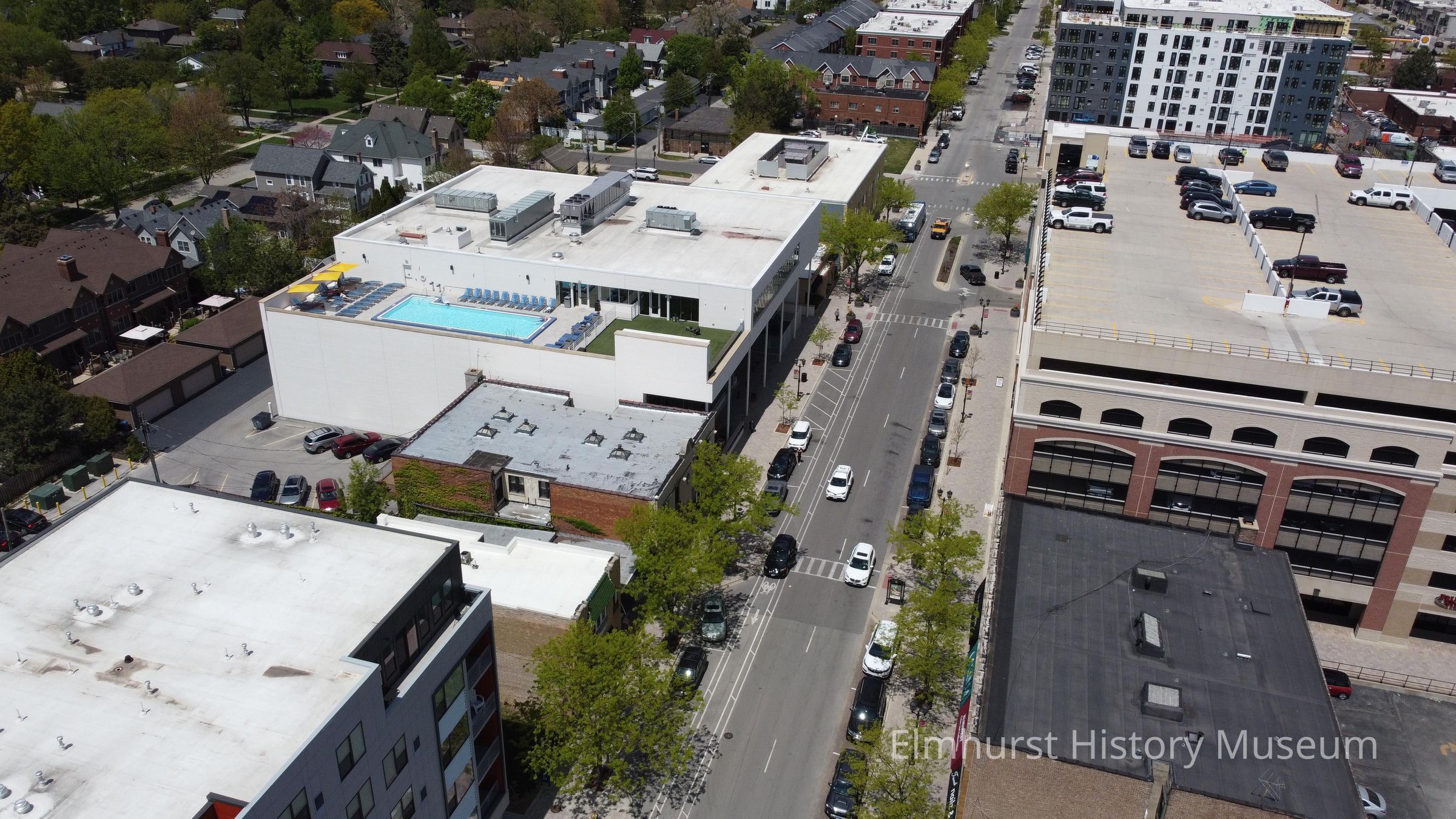 Aerial view of downtown Elmhurst, looking north along N. Addison Avenue. Fitness Formula Club at 140 N. Addison is at left, and the Addison Parking Deck is at right.Photograph Details