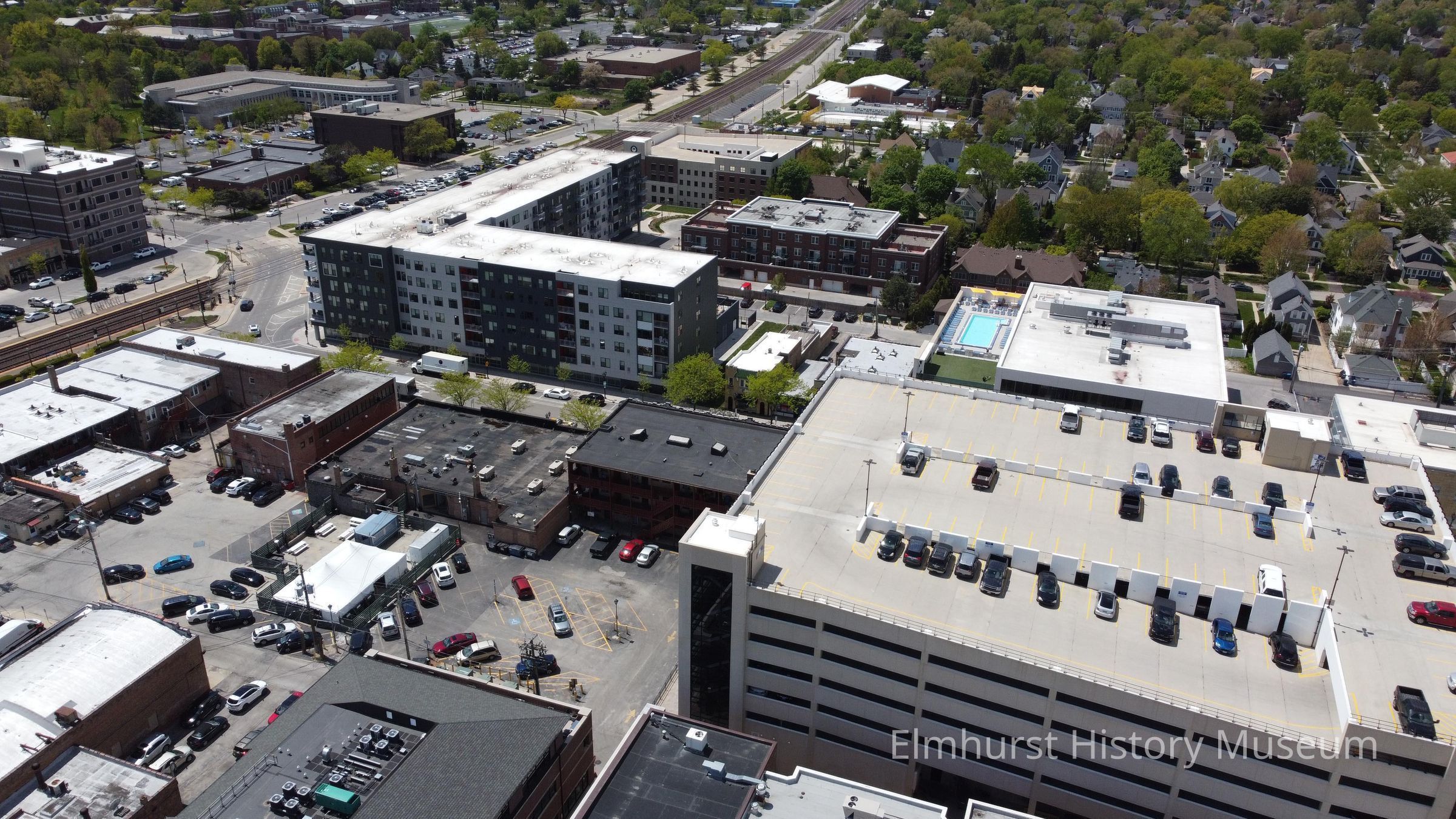 Aerial view of downtown Elmhurst, looking west towards N. Addison Avenue. The Addison Parking Deck is at right.Photograph Details
