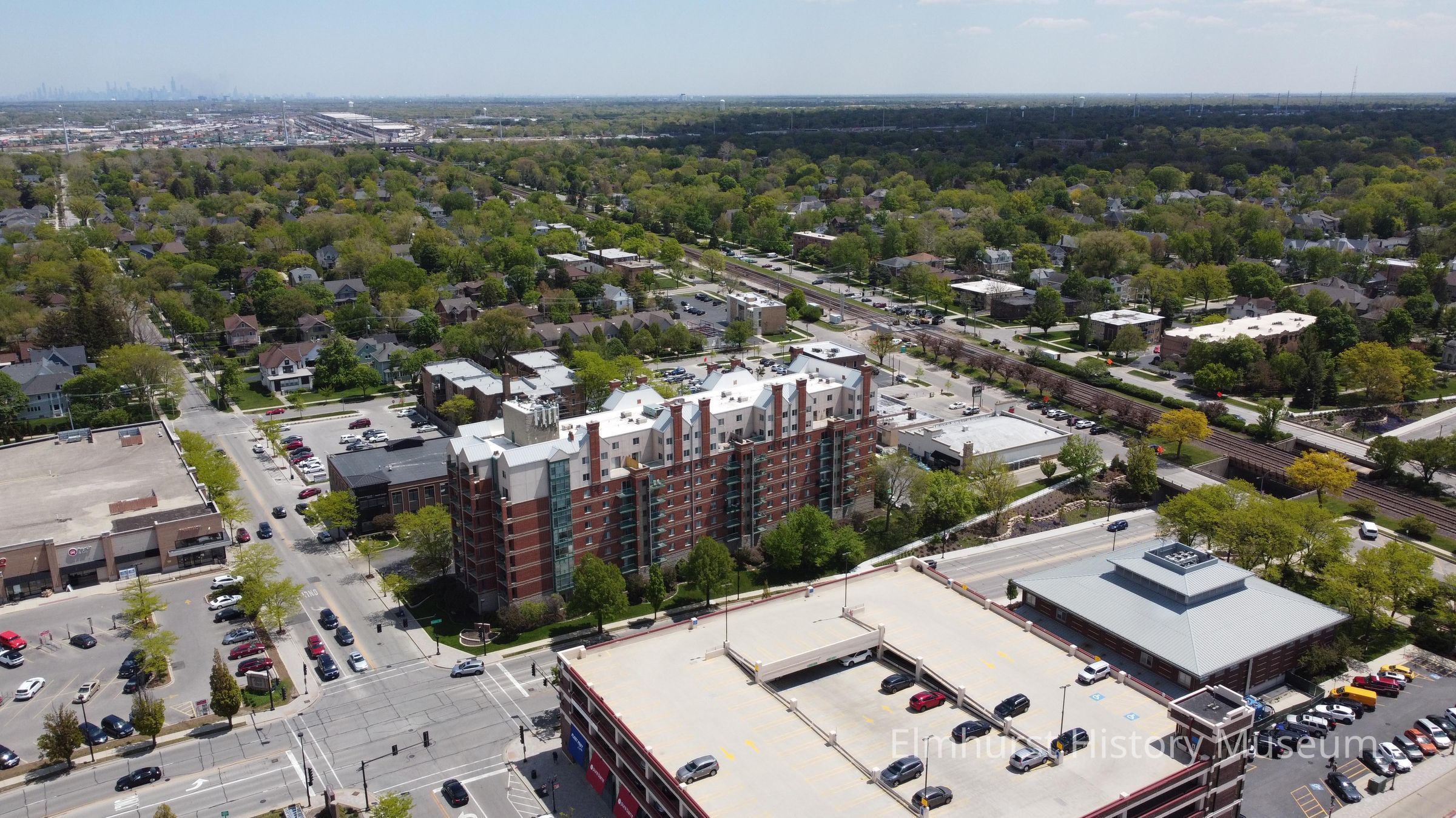 Aerial view of downtown Elmhurst, looking southeast towards Elmhurst Place Apartments.Photograph Details