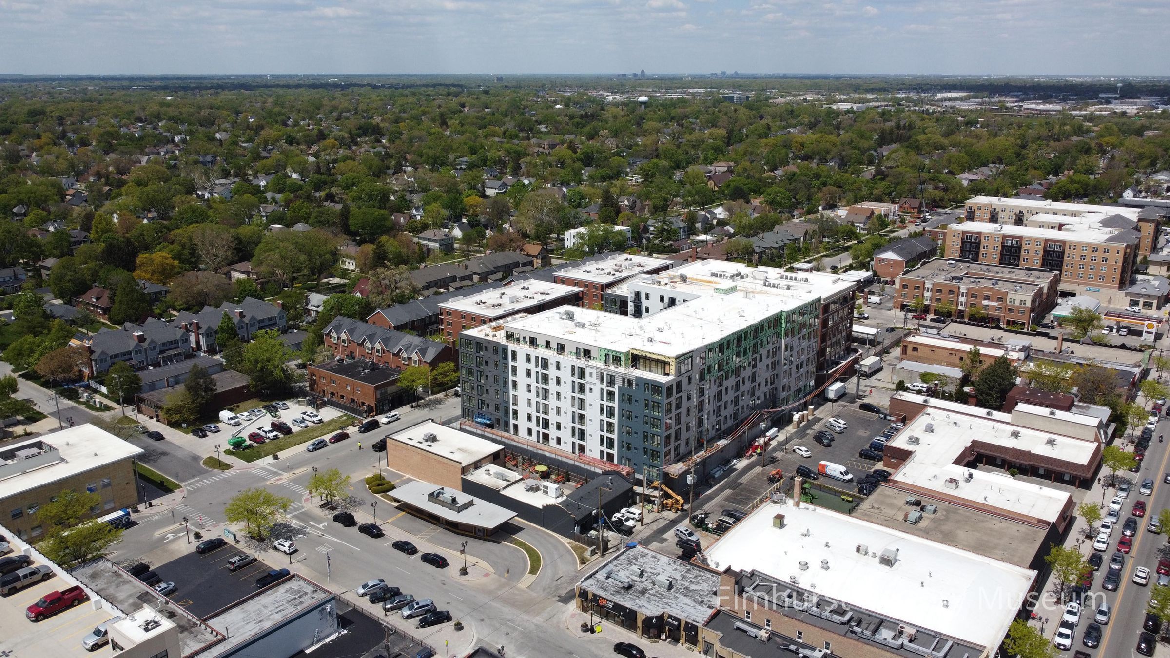 Aerial view of downtown Elmhurst, looking northwest towards the Finn apartment building at 182 N. Addison Avenue.Photograph Details