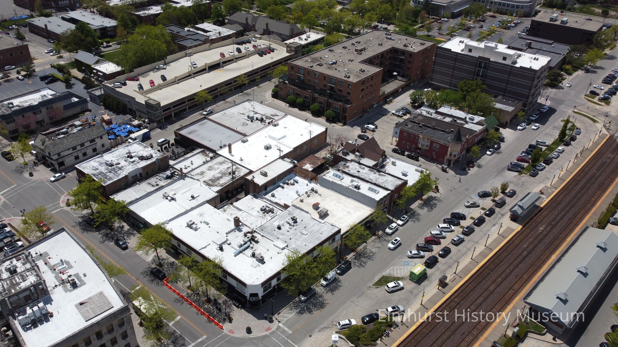 Aerial view of downtown Elmhurst, looking southwest from the intersection of S. York Street and Park Avenue. 100 South Restaurant is in the foreground.Photograph Details