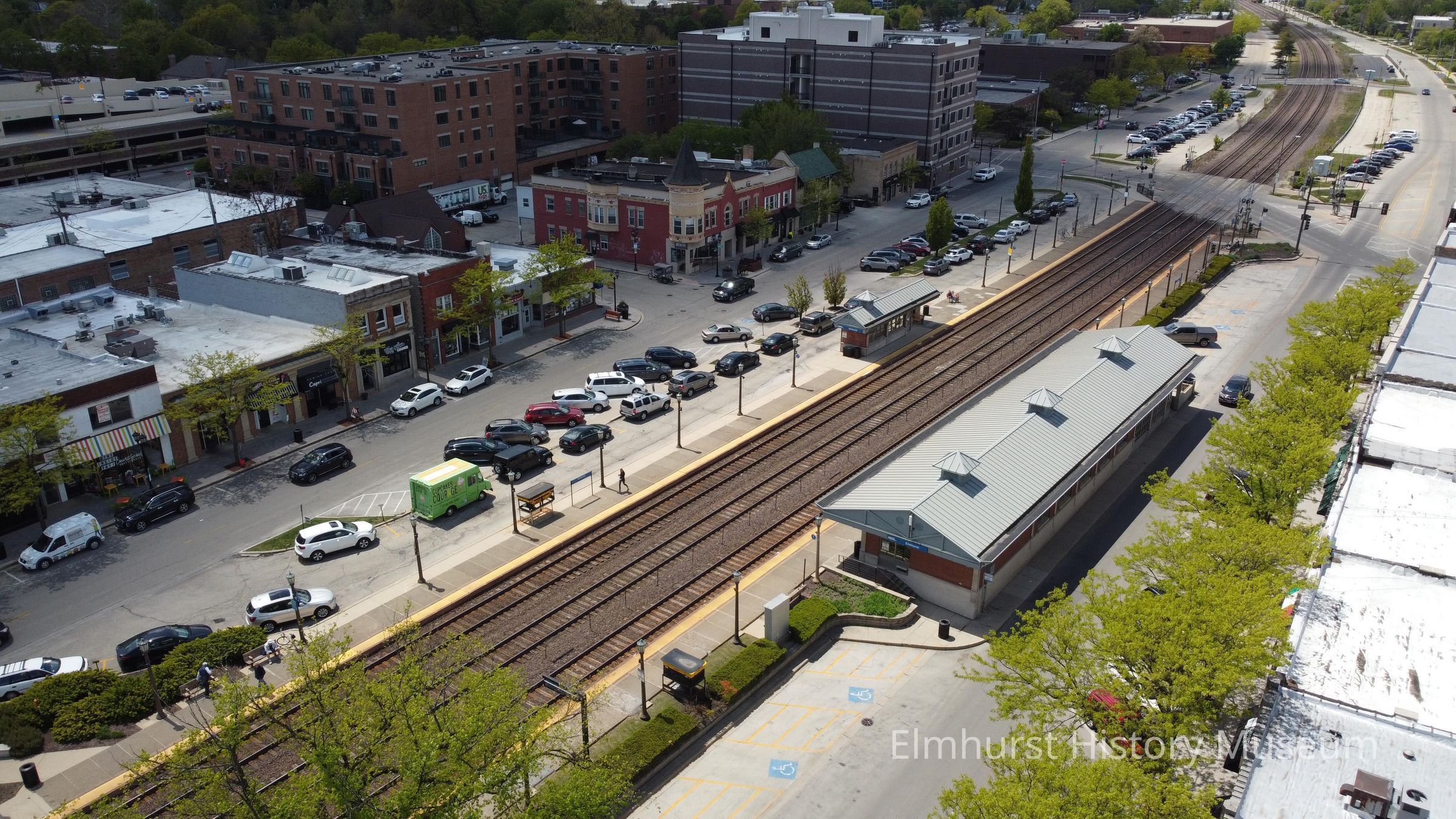 Aerial view of downtown Elmhurst, focus on the Metra Station and shelter along E. First Street and E. Park Avenue.Photograph Details