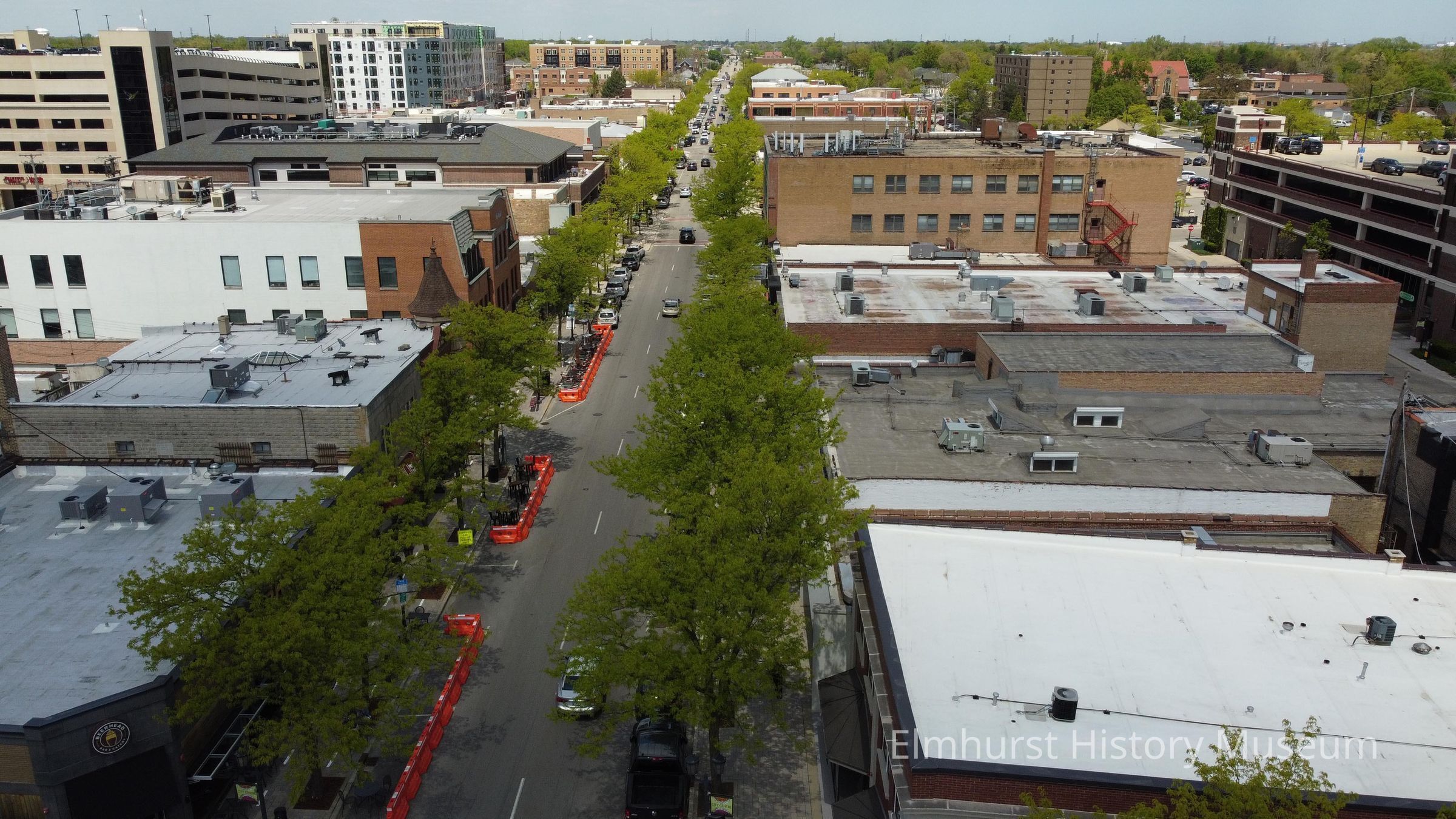 Aerial view of Downtown Elmhurst, looking north along N. York Street from First Street.Photograph Details