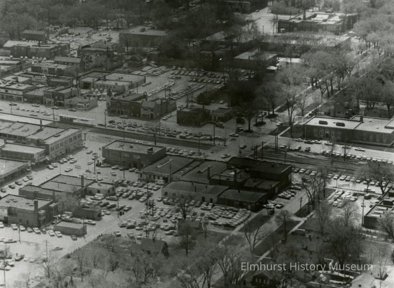 Aerial view of Elmhurst looking south across railroad tracks at the Cottage Hill Avenue crossing. Addison Avenue is at left of photo, post office right center.Made/Created