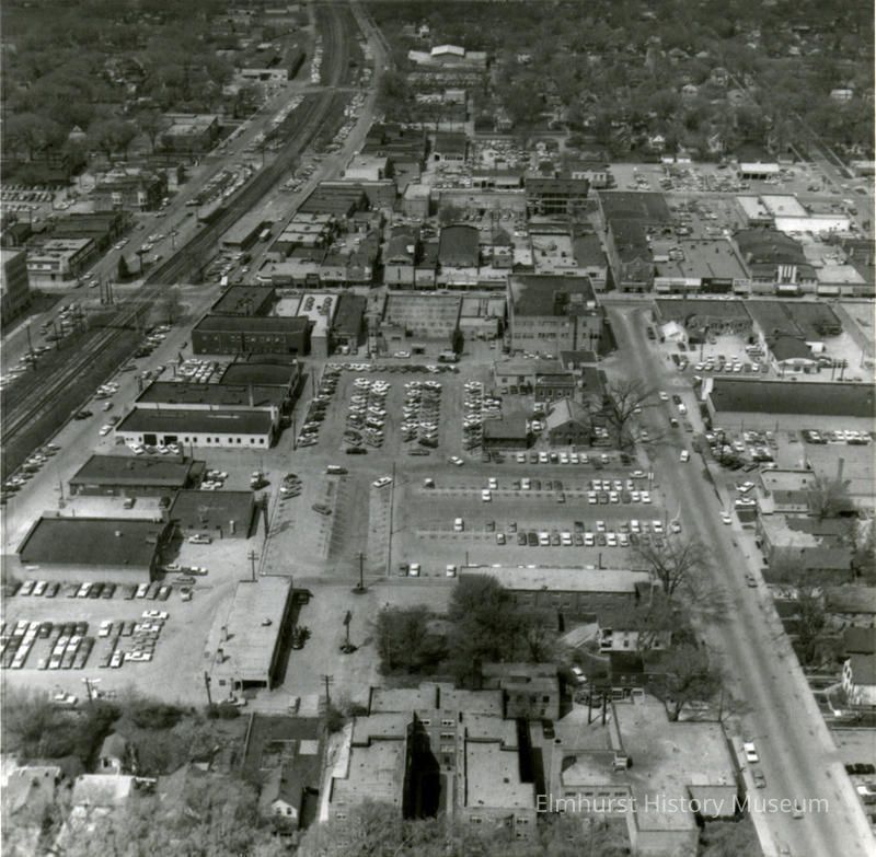 Aerial view of downtown Elmhurst, looking west down Schiller from Haven Road.Photograph Details