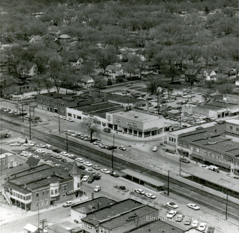 Aerial view of downtown Elmhurst, looking northwest at the intersection of Addison Avenue and First Street.Photograph Details