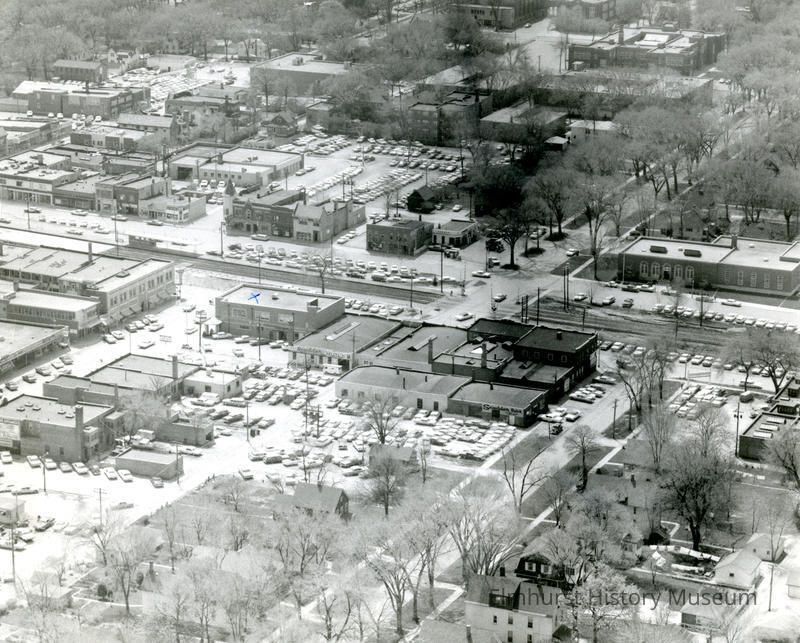 Aerial view of the Downtown Elmhurst, specifically the block between Addison Avenue and Larch Avenue, north of the Chicago and North Western Railroad.Photograph Details