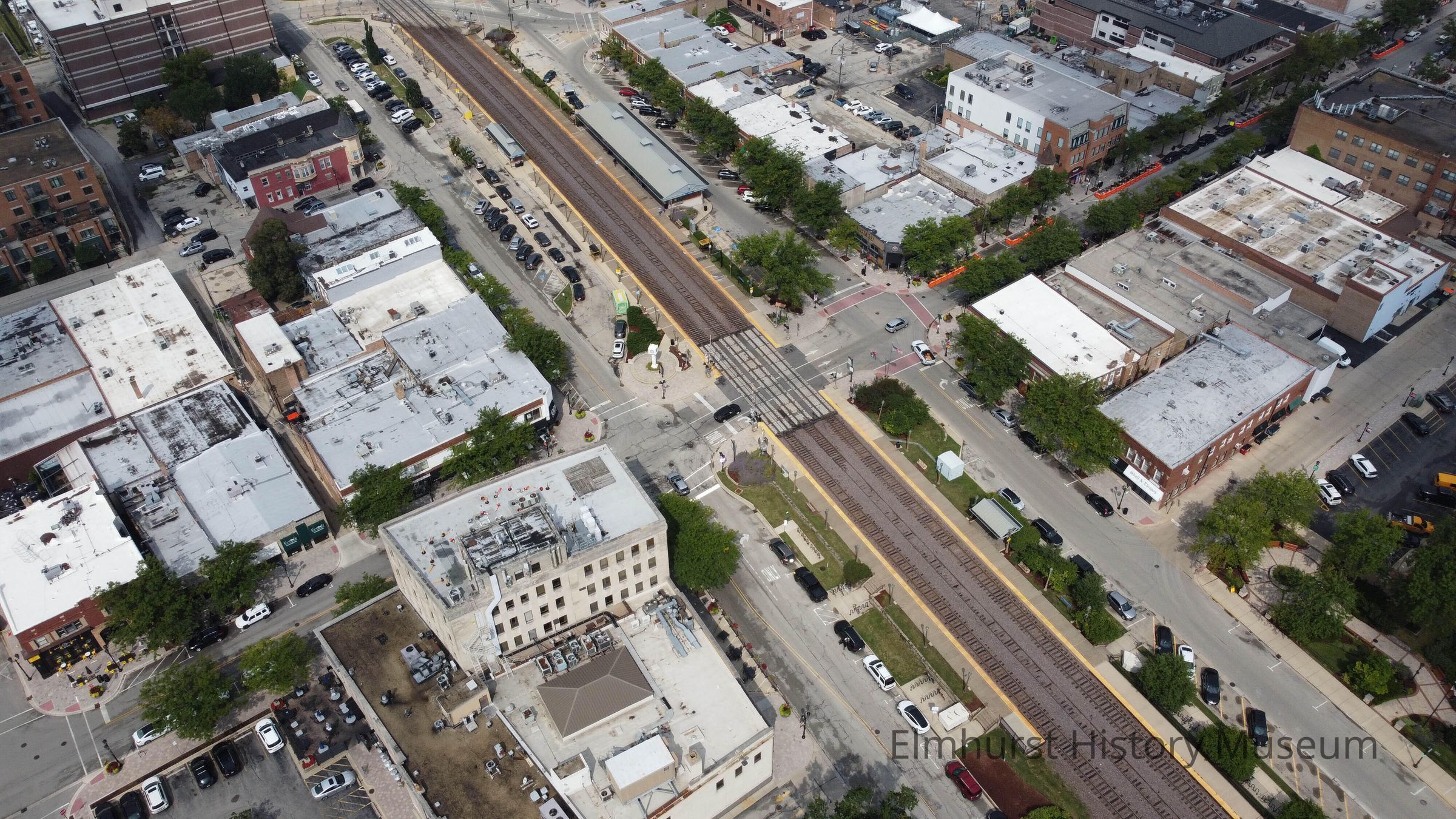 Aerial view of the intersection of S. York Street and the Union Pacific railroad tracks in downtown Elmhurst.Photograph Details