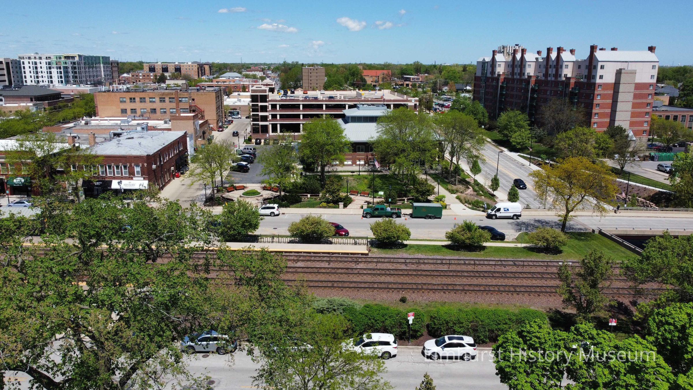 Aerial view of E. First Street, looking northfrom Elmhurst History Museum grounds. Elmhurst Police Department is at center, and E. Park Avenue is in foreground.Photograph Details
