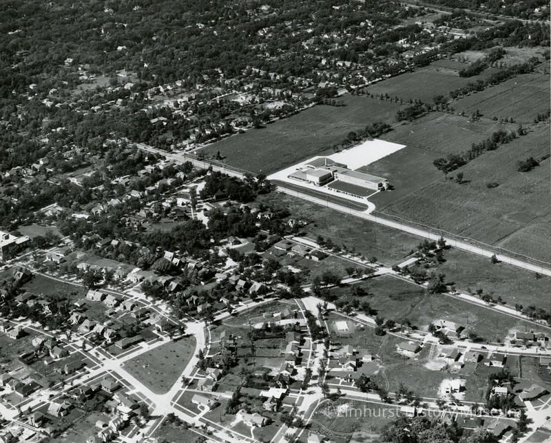 Photograph. Aerial View of Elmhurst looking northwest. Elmhurst Junior High School, later renamed Sandburg, is visible. A partial view of Crescent Park Subdivision is in the foreground.Made/Created