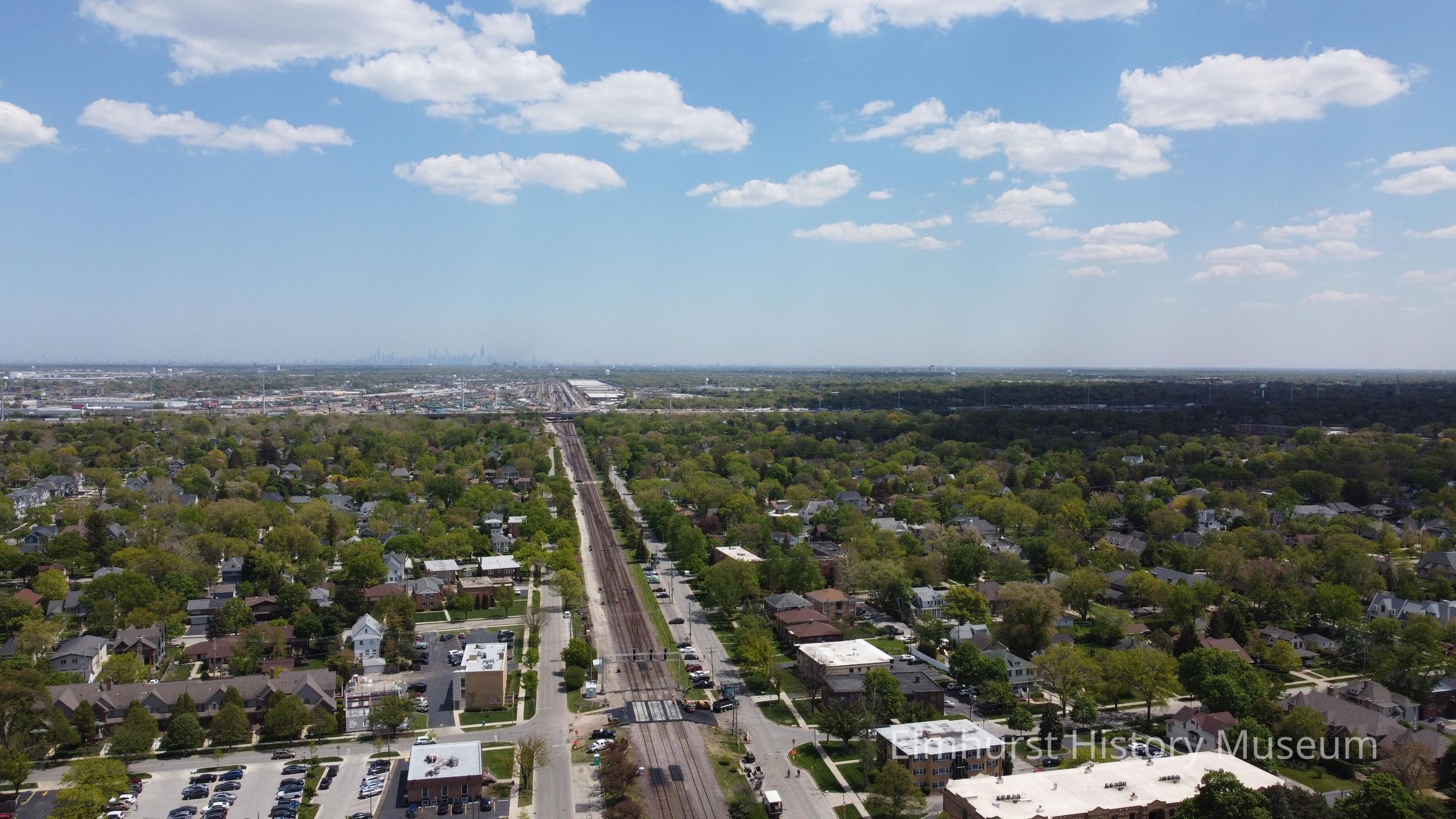 Aerial view of Elmhurst, looking east along the Metra railroad tracks towards Chicago.Photograph Details