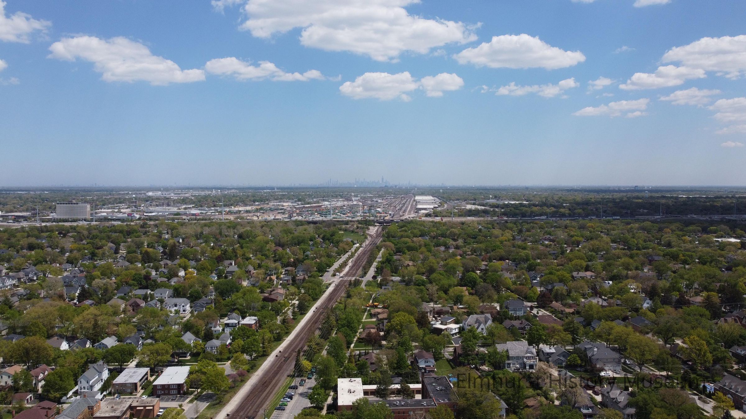 Aerial view of Elmhurst, looking east towards Chicago along the Metra railroad tracks.Photograph Details