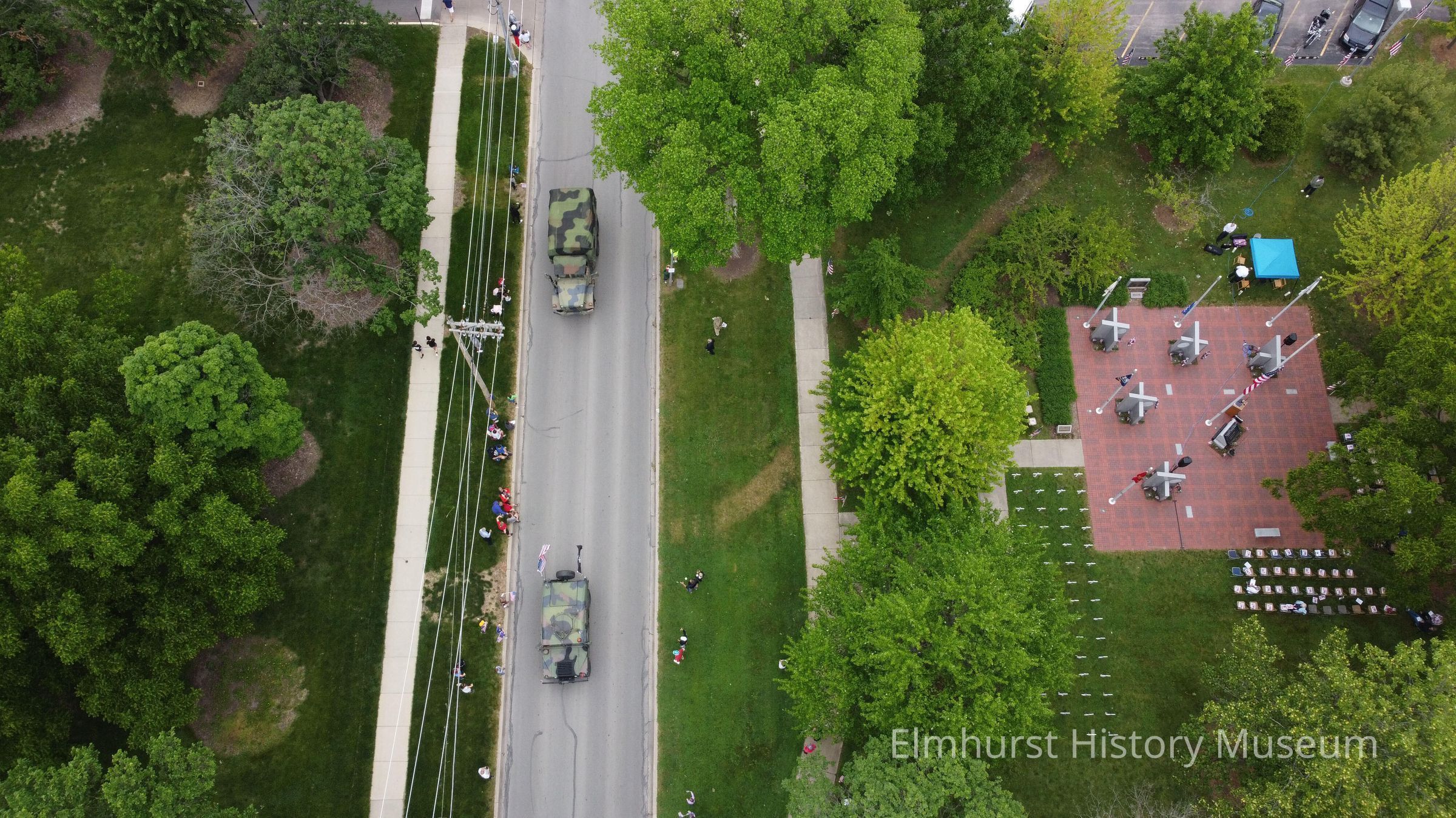 Aerial view of 2021 Elmhurst Memorial Day Convoy on Prospect Avenue. Veterans Memorial in Wilder Park is at right.Photograph Details