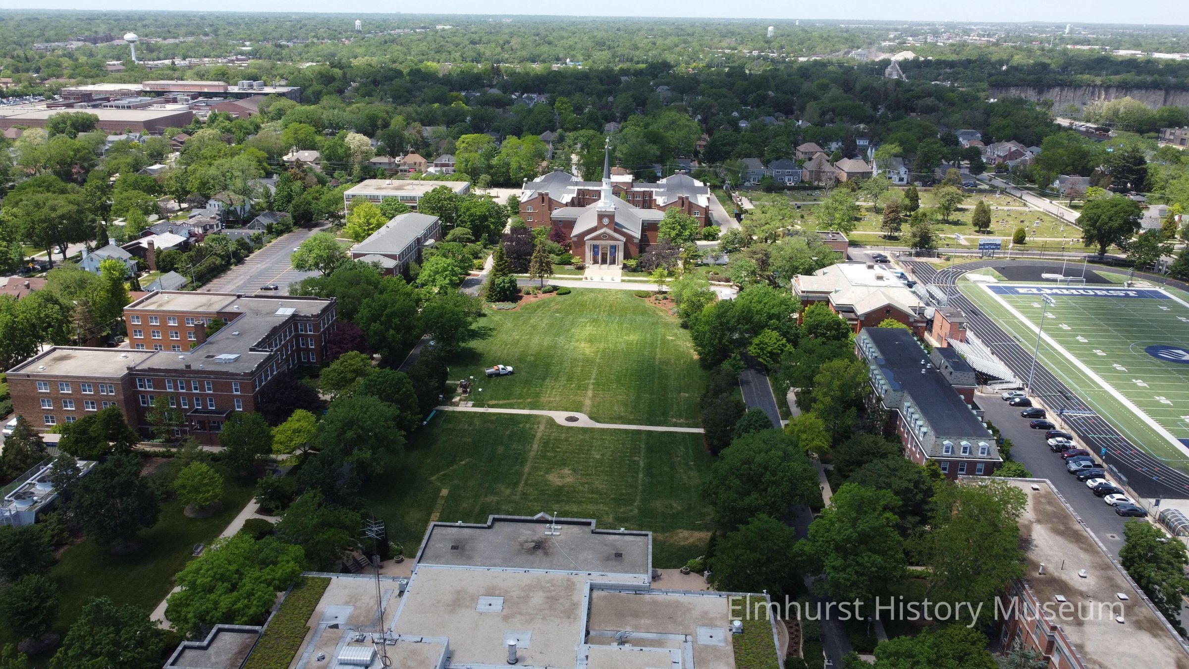 Aerial view of Elmhurst University campus, looking west.Photograph Details
