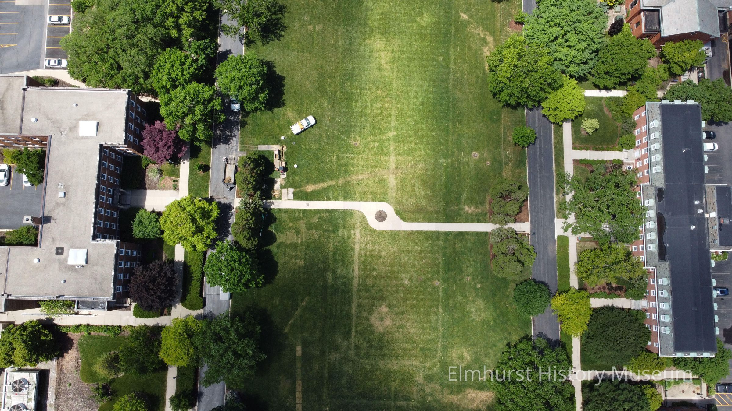 Aerial view of Elmhurst University mall. Schick Hall is at left, and Lehmann Hall is at right.Photograph Details