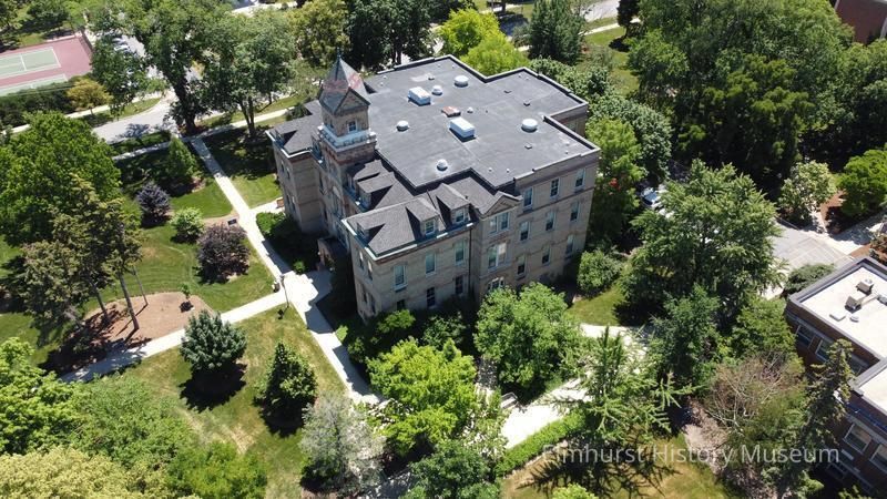 Aerial View of Elmhurst University Campus, focusing on Old Main administrative building.Photograph Details