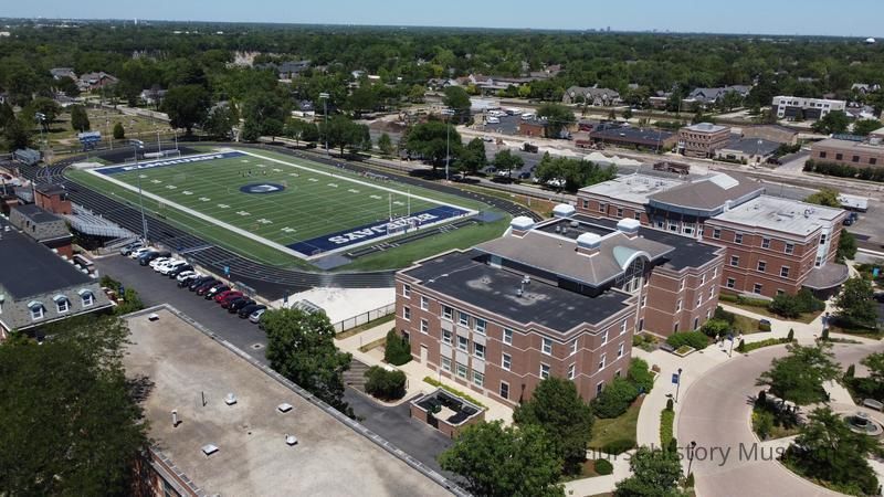 Aerial View of Elmhurst University Campus, including Langhorst Stadium and Cureton Hall.Photograph Details