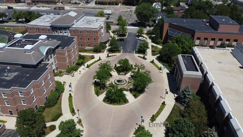 Aerial View of Elmhurst University campus, focusing on Alumni Circle.Photograph Details
