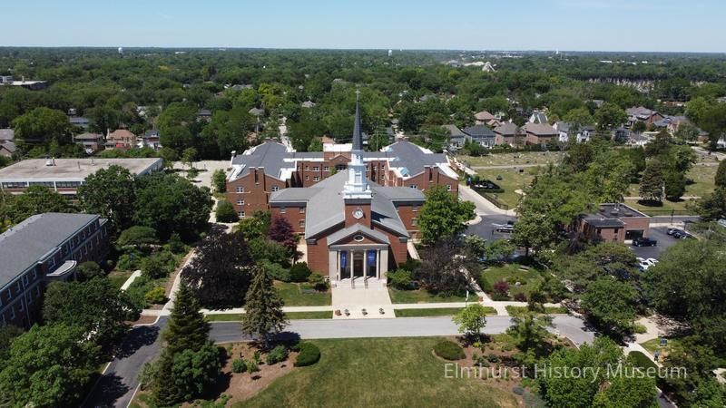 Aerial View of Elmhurst University Campus, focusing on Hammerschmidt Memorial Chapel.Photograph Details