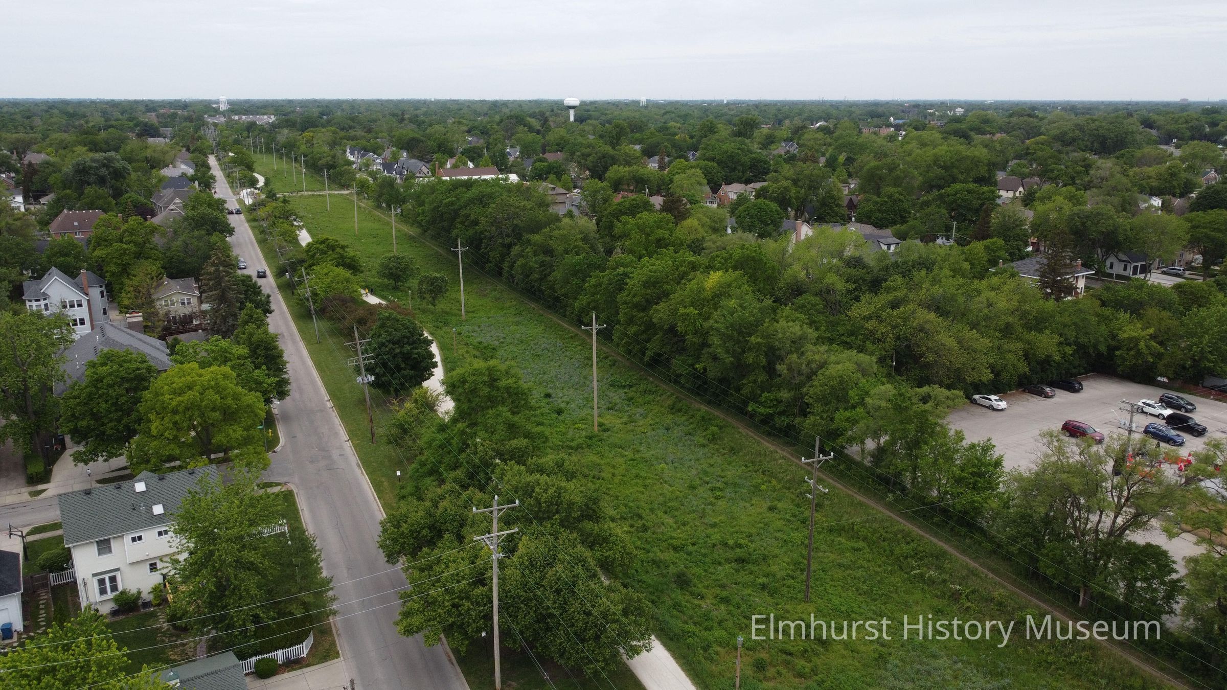 Aerial view of the Illinois Prairie Path and the Great Western Prairie, looking west from Spring Road.Photograph Details