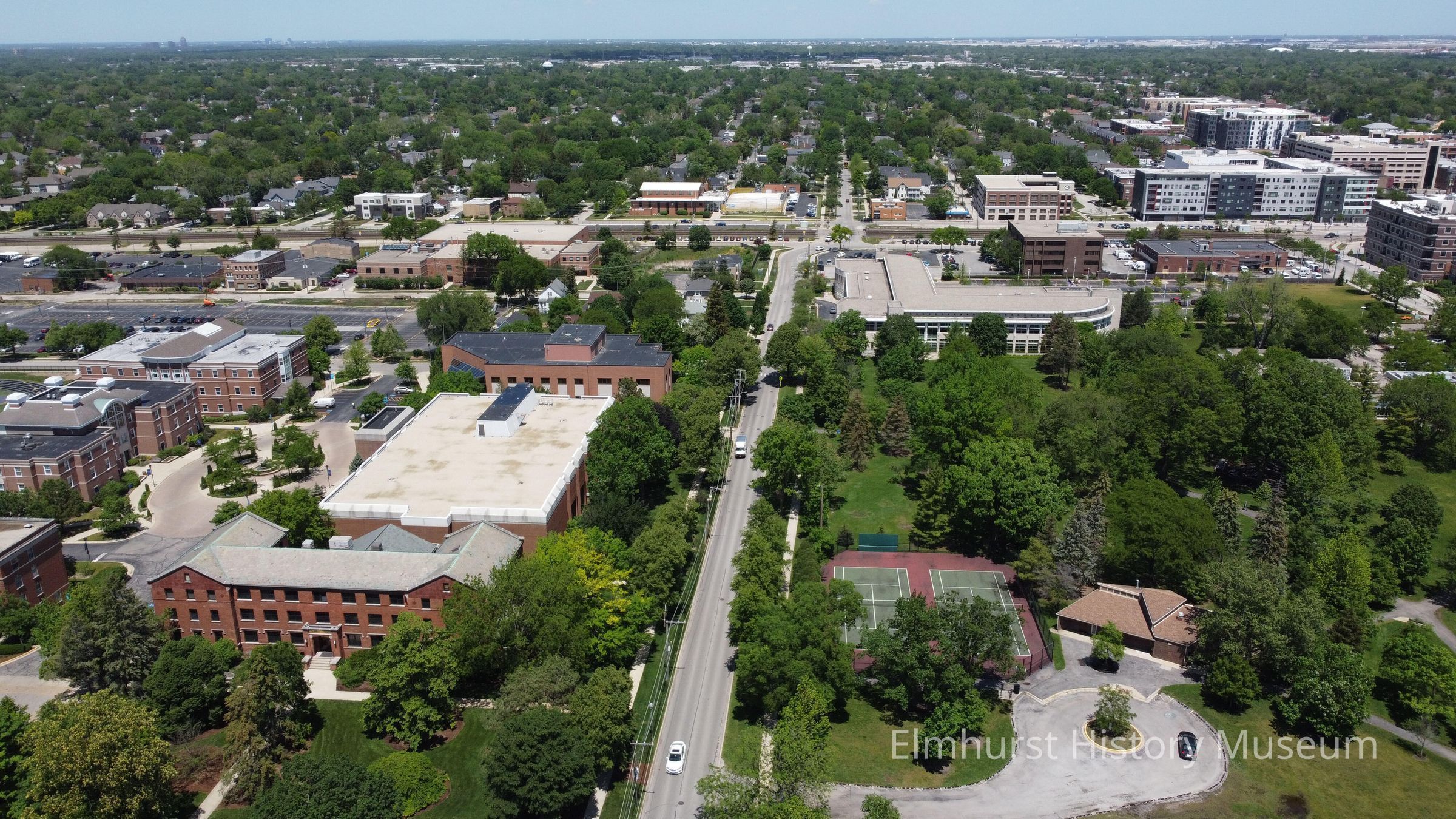 Aerial view of Prospect Avenue, looking north towards W. Park Ave. Elmhurst University is at left, and Wilder Park is at right.Photograph Details