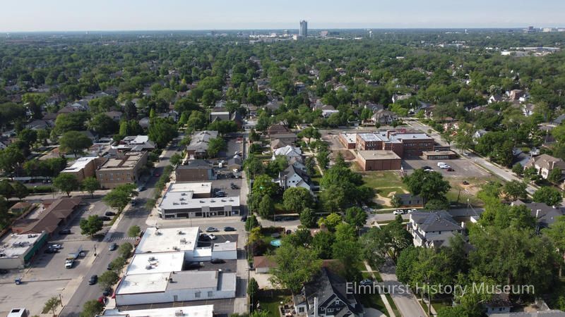 Aerial view of Spring Road Business District, looking south from the Illinois Prairie Path. Lincoln Elementary School is at right, shortly before demolition.Photograph Details