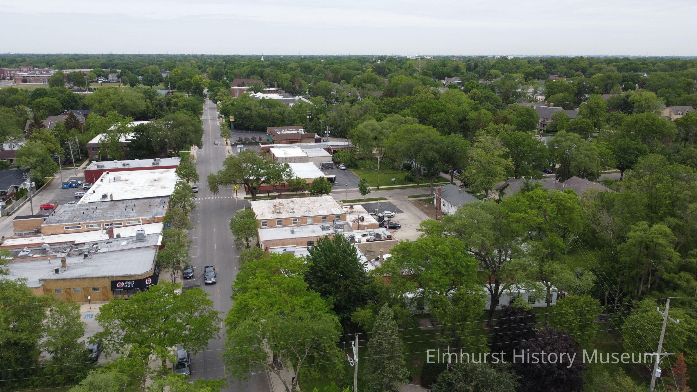 Aerial view of Spring Road Business District, looking south along Spring Road the Illinois Prairie Path.Photograph Details
