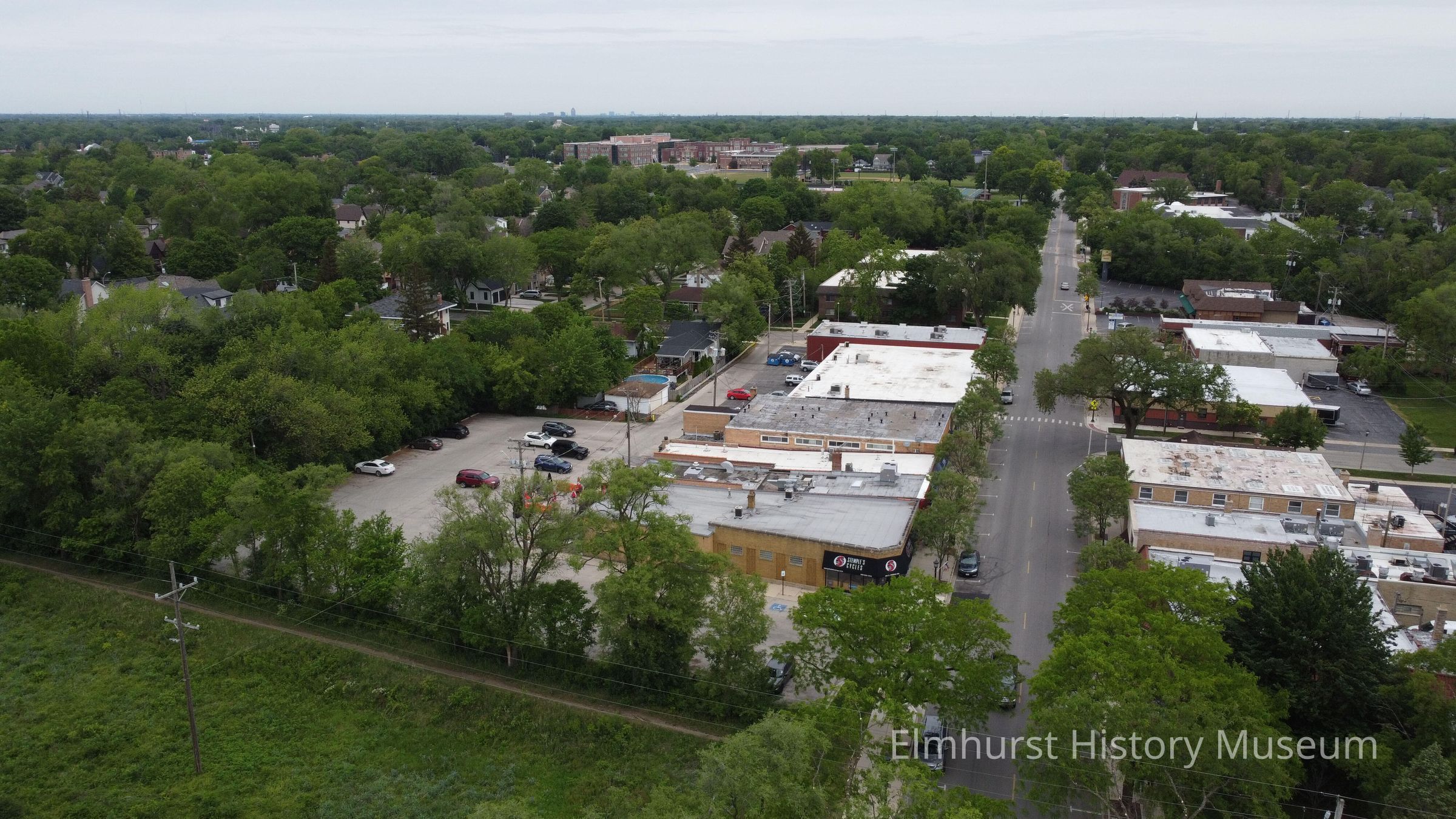 Aerial view of Spring Road Business District, looking south along Spring Road the Illinois Prairie Path.Photograph Details