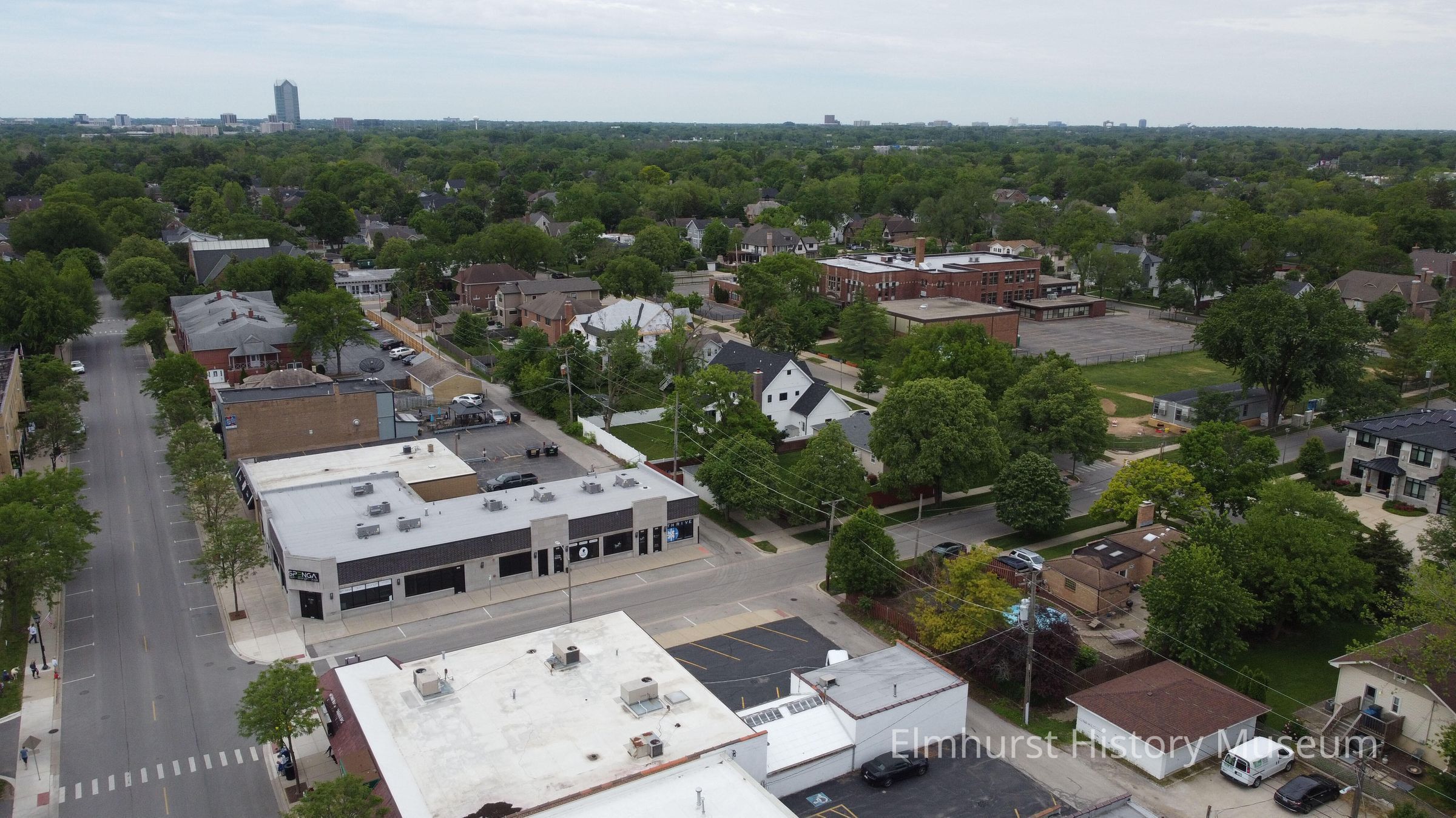 Aerial view of Spring Road Business District, looking south along Spring Road from Montrose Avenue. Lincoln Elementary is visible in background shortly before demolition.Photograph Details