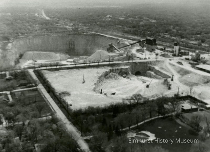 Black and white photograph, aerial view of the Elmhurst-Chicago Stone Company Quarry, looking east.Inscription/Signature/Marks