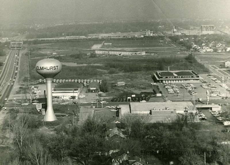 An aerial view of the intersection of Route 83 and St. Charles Road looking north. The City of Elmhurst Public Works garage on West Avenue is in the background, as is Elmhurst-Chicago Stone Company. Route 83 is on the left. Eagle Food store is on south side of St. Charles Road.Photograph Details